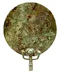 | Sonstige Gebrauchsgegenstände | Handspiegel | Bronze und Koralle | Durchmesser der Spiegelscheibe 189 mm. Stärke der Spiegelscheibe 1,3 mm. Der Griff endet in einer Tülle, die am Ende hohl ist. Vermutlich war hier ein Griff aus vergangenen Material angebracht. Zur Spiegelfläche hin beidseitige Darstellung eines Oberkörpers mit Januskopf. Arme nach oben angewinkelt. Die Spiegelfläche war durch die Hände mit dem Griff verbunden. Verzierung der Handflächen mit Koralle. Kopf eingerahmt von fischblasenförmigen Blätter. Unter dem Spiegel die Reste eines feinen Gewebes mit den Maßen 133 mm × 95 mm. Darunter ein Holzfragment von 5 mm bis 10 mm. Die Maserung lässt auf Eichenholz schließen und stammt wahrscheinlich vom Boden der Grabkammer. | 1 | Keller Nr. 15 und Nr. 201 |