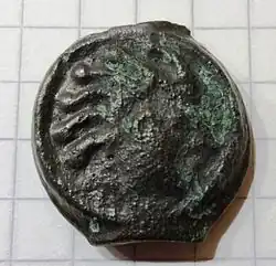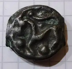 - ↑ Gisela Förschner: Die Münzen der Kelten-Ausstellung der Bestände des Münzkabinetts (= Kleine Schriften des Historischen Museums Frankfurt am Main. Band 18). Verlag Gutenberg, Melsungen 1983, ISBN 3-87280-019-1, S. 14.