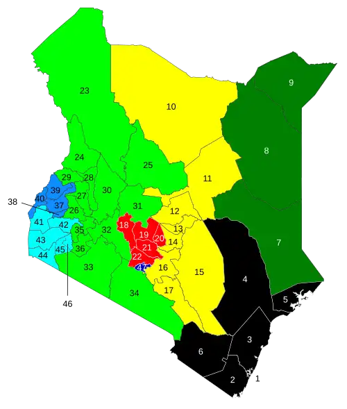 - ↑ Kenia: Verwaltungsgliederung (Provinzen und Countys) – Einwohnerzahlen, Grafiken und Karte. Abgerufen am 3. Januar 2019.