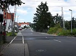 Falkenbergstraße mit Bahnübergang als Haupterschließungsstraße des Stadtteils