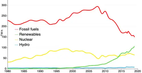 Am 30. September 2024 wurde das Kraftwerk Ratcliffe-on-Soar als letztes Kohlekraftwerk im UK geschlossen. Der Anteil von Gas am Strommix betrug 2022 mehr als 38 Prozent. Der Stromverbrauch des UK ging in den Jahren zuvor zurück; zugleich stieg der Anteil der Windkraftanlagen an der Stromerzeugung stark.[21]