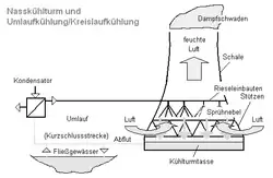 Zur vollständigen Kondensation des Niedrigdruck-Dampfes wurden zwei Naturzugkühltürme, beide mit einer Höhe von 143 Metern, eingesetzt. Sie waren über einen weiteren Kühlkreislauf mit dem Kondensator verbunden. Der Durchmesser der Kühltürme an der Basis betrug 104 Meter, der Austrittsdurchmesser oben 64 Meter.[8] Pro Stunde wurden 160.000 Kubikmeter dem Main entnommenes Wasser im Kreislaufbetrieb umgewälzt. Das Wasser passierte den Turbinenkondensator und wurde anschließend im Kühlturm auf zehn Meter Höhe gepumpt. Dort wurde es gleichmäßig verteilt und rieselte in die Kühlturmtasse, den Sammelbereich des herabrieselnden Wassers, der die komplette Basis des Kühlturmes einnahm. An der von unten in den Kühlturm einströmenden Luft verdunsteten etwa 1½ bis 2 Prozent des Wassers, wodurch sich das Wasser um etwa 13 Kelvin abkühlte.[9] Nach anderer Quelle waren es 0,035 Prozent,[10] im Vergleich zur umgewälzten Menge durch Verdunstung. Von der Kühlturmtasse gelangte das Kühlwasser in den Turbinenkondensator zurück.