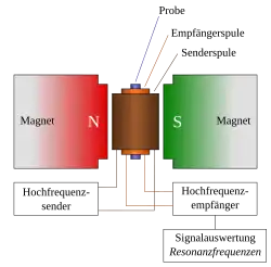 Eine NMR-Apparatur besteht typischerweise aus einem Magneten zur Erzeugung eines möglichst starken und homogenen statischen Magnetfelds, in das die Probe eingebracht werden kann, und je einer kleinen Magnetspule für Erzeugung bzw. Nachweis eines hochfrequenten transversalen Magnetfelds (s. Abb.). Bloch und Purcell benutzten in ihren ersten erfolgreichen Apparaturen ein statisches Feld der Größenordnung 1 T, erzeugt durch einen Elektromagneten. Zur Verbesserung der räumlichen Konstanz des Felds und zu seiner Feinregelung waren kleine Zusatzspulen angebracht. Bei ist die Resonanzfrequenz von Protonen . Die Spule, welche zum Empfang des hochfrequenten Magnetfelds diente, war bei Blochs Apparatur senkrecht zur Senderspule ausgerichtet, um den direkten Empfang des von der Senderspule erzeugten Wechselfelds zu eliminieren. Die von der Empfängerspule abgegebene Wechselspannung ist dann nur von den Protonen verursacht, deren magnetische Momente mit der Larmorpräzession um die Feldrichtung rotieren, nachdem sie durch das eingestrahlte Wechselfeld im Resonanzfall erfolgreich aus der Richtung des statischen Felds weggedreht worden sind. Purcell benutzte in seiner Apparatur nur eine Spule für Sendung und Empfang, wobei die Resonanz sich dadurch bemerkbar macht, dass die von den Kernen in der Spule induzierte Wechselspannung zur angelegten Wechselspannung entgegengesetzt ist, wodurch dem Sender mehr Energie entzogen wird. Bei einem absichtlich schwach ausgelegten Sender führt das zu einer leicht nachweisbaren Verringerung der Schwingungsamplitude. Um die Resonanz zu finden, ohne die Frequenz des Senders verstellen zu müssen, wurde durch die Zusatzspulen die Feldstärke des statischen Felds variiert. Daher wurden die Resonanzkurven nach der Purcell-Methode in den NMR-Spektren nicht über der Frequenz aufgetragen, sondern über dem angelegten Magnetfeld .