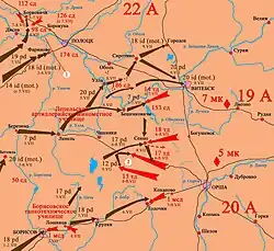 - Die im deutschen Hauptangriffsfeld liegende 20. Armee unter Generalleutnant P. A. Kurotschkin versuchte die Angriffe zwischen Witebsk und Orscha zu stoppen. Südlich davon – noch am linken Ufer des Dnjepr bis Rogatschew operierte die 13. Armee unter Generalleutnant Remesow.