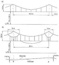 Gegenüber dieser prinzipiellen Bauart ist im Vergleich zu Fahrleitungen der heutigen Zeit kein wesentlicher Unterschied zu entdecken, lediglich die Bauteile haben sich geändert. So sind heute keine Holzmasten mehr üblich und die Form und Werkstoffe der Isolatoren haben sich verändert. Bei der Erstausführung in Niederschöneweide geht aus der Literatur nicht hervor, ob und wie die Seile abgespannt wurden. Bei der später aufgekommenen sogenannten Einheitsleitung von 1925 bis 1942 war lediglich der Fahrdraht, nicht aber die Halteseile abgespannt. Erst danach kam es auch zur Abspannung der Halteseile.[2] Auch die Ausleger änderten sich mehrfach; waren sie bei Niederschöneweide-Spindlersfeld noch waagerecht am Mast befestigt,[1] sind bei den Fahrleitungen zu Zeiten der DRG die Formeisen-Ausleger statisch günstiger schräg am Mast befestigt und trugen das Halteseil. Der Fahrdraht war an einem waagerechten Ausleger am Mast befestigt. Es kamen gelegentlich einige Y-Beiseile an der Stelle der Masten hinzu.[2]