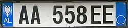 Die aktuellen Kfz-Kennzeichen wurden am 16. Februar 2011[1] eingeführt und orientieren sich maßgeblich an den italienischen Euro-Kennzeichen. Die Schilder zeigen an beiden Enden ein blaues Feld. Am linken Rand beinhaltet es den Doppeladler des albanischen Wappens sowie das Nationalitätszeichen AL. Auf der rechten Seite kann das Zulassungsjahr sowie der Regionscode im blauen Feld erscheinen. Beide Angaben sind allerdings wie in Italien freiwillig und werden eher selten dargestellt, sodass das rechte blaue Feld häufig leer bleibt. Die eigentliche Kombination ist fortlaufend und ermöglicht somit keinerlei Rückschlüsse auf die Herkunft des Fahrzeuges. Sie besteht aus zwei Buchstaben, gefolgt von einem Hologramm, drei Ziffern und weiteren zwei Buchstaben.[2]