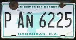 Die Nummernschilder besitzen einen weißen Untergrund und schwarze Aufschrift. Im Hintergrund befindet sich der Umriss des Landes, der wie auch der Rand des Schildes je nach Fahrzeugart eine andere Farbe aufweist. Die eigentliche Kombination besteht aus einem Buchstaben, der die Fahrzeugart näher definiert, zwei fortlaufenden Serienbuchstaben sowie einer vierstelligen Zahl. Über der Prägung zeigt jedes Schild den spanischsprachigen Slogan Cuidemos los Bosques (etwa: Kümmern wir uns um die Wälder), am unteren Rand befindet sich der Schriftzug HONDURAS, C.A., wobei C.A. für Centro América (Zentralamerika) steht. Auf honduranischen Kfz-Kennzeichen kann auch der spanische Buchstabe Ñ vorkommen. Die Schilder werden vom Secretaría de Obras Públicas, Transporte y Vivienda (SOPTRAVI) vergeben.