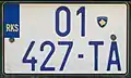 Die Kfz-Kennzeichen des Kosovo wurden am 6. Dezember 2010[1] eingeführt und sind in der Regel weiß mit schwarzer Aufschrift. Die Schilder enthalten in Anlehnung an die Euro-Kennzeichen einen blauen Streifen am linken Rand mit den Buchstaben RKS (für Republik Kosovo). Eine zweistellige Zahl gibt im Folgenden die entsprechende Region an, bevor das kosovarische Wappen auf dem Schild erscheint. Es folgen drei Ziffern und – von einem Strich getrennt – zwei Buchstaben als fortlaufende Seriennummer.[2]