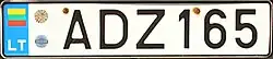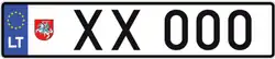 Am linken Rand befindet sich ein blaues Feld mit den europäischen Sternen und dem Nationalitätszeichen LT, das am 20. September 2004 und damit kurz nach dem Beitritt Litauens zur Europäischen Union am 1. Mai 2004 eingeführt wurde.[1] Zwischen dem Buchstaben- und Zahlenblock erscheint ein Aufkleber der Hauptuntersuchung (litauisch TA = techninė apžiūra) sowie eine Hologramm-Plakette. Neben dem Standardmaß existieren Schilder in US-amerikanischer Größe sowie zwei verkleinerte Formate für Zweiräder. Die genaue Herkunft des Fahrzeugs kann an den Schildern nicht abgelesen werden.