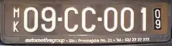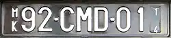 Die aktuellen nordmazedonischen Kfz-Kennzeichen entsprechen dem europäischen Standardmaß von 520 × 110 mm. Sie bestehen aus zwei lateinischen Buchstaben für die Herkunft, vier Ziffern und weiteren zwei Buchstaben. Zwischen den ersten beiden Buchstaben und den Ziffern befindet sich ein rot eingerahmtes Schild, in dem die regionalen Buchstaben und zwei weitere Buchstaben in kyrillischer Schrift erscheinen. Am linken Rand befindet sich in Anlehnung an die Euro-Kennzeichen ein blaues Feld mit dem Nationalitätszeichen NMK (bis 2019 MK). Die derzeitigen Nummernschilder wurden am 20. Februar 2012 eingeführt.[1] Nachdem sich die ehemalige jugoslawische Republik Mazedonien und Griechenland über den Namen des Landes einig geworden sind, nannte sie sich am 12. Februar 2019 in Republik Nordmazedonien um. Vom Innenministerium aus wurden alle Kennzeichen als Übergangslösung mit dem Aufkleber NMK überklebt. Die Ausgabe der neuen Kennzeichen war ab Juni 2019 vorgesehen.[2]