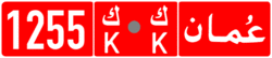 - Export-Kennzeichen: Weiße Schrift auf blauem Grund mit weißer Umrandung. Schild ist dreigeteilt. Auf der rechten Seite der Schriftzug Oman (oben in arabischer, unten in lateinischer Schrift). In der Mitte unten die Abkürzung EXP für Export und darüber das arabische Wort (arabisch تَصْدِير, DMG taṣdīr) für Ausfuhr. Auf der linken Seite oben eine fortlaufende fünfstellige Zahl und unten die vierstellige Jahreszahl der Ausfuhr (z. B. 2008) in lateinischer und arabischer Schrift. Rechts neben der Jahreszahl befindet sich das omanische Staatswappen als kleiner schwarzer Aufdruck; links als kleines Hologramm.