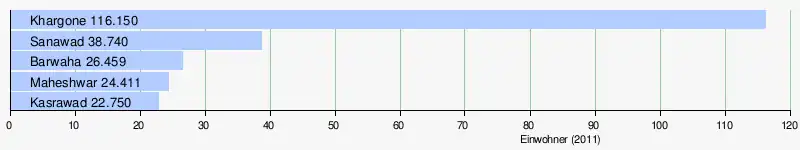 Weitere Städte mit mehr als 10.000 Bewohnern sind Bhikangaon (16.217 Einwohner), Barwaha Kasba (13.514 Einwohner), Mandleshwar (12.343 Einwohner), Jaitpur (11.835 Einwohner) und Gogaon (11.054 Einwohner).