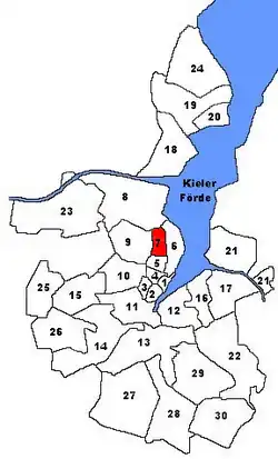 - ↑ Stadtplan der Stadt Kiel herausgegeben von der Stadt Kiel mit detaillierten Stadtteilgrenzen.