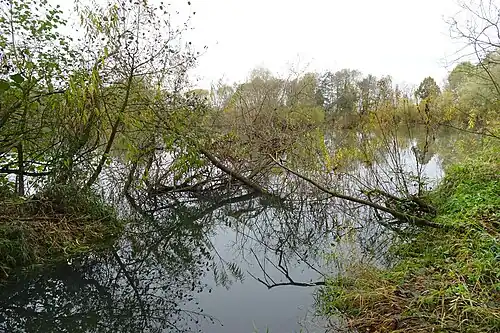 ![]() Der Kiessee wird von einem geschlossenen Ufergehölzsaum eingerahmt, in dem Weiden mit ihren weit ins Wasser ragenden Ästen vorherrschen. | ||