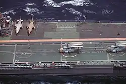Das Flugdeck war mit dem darunter befindlichen Hangar über zwei Aufzüge verbunden, die sich backbords und achtern der Aufbauten befanden.