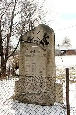 - Das Denkmal für die Gefallenen des Ersten Weltkriegs wurde 1924 aufgestellt. 1945 wurde das Denkmal vergraben. 1996 wurde das Denkmal wieder aufgestellt.[10]