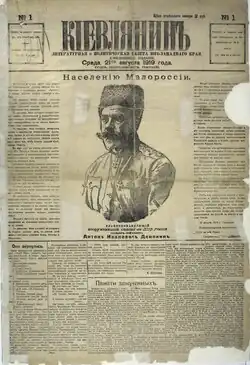 Als Reaktion auf den polnischen Januaraufstand gründete Witali Schulgin, ein Lehrer am Kiewer Institut für edle Jungfrauen, auf Initiative der Verwaltung des Generalgouvernements Kiew die Zeitung Kijewljanin, deren Zweck sein sollte, den polnischen Einfluss in der Region zu beseitigen. Sie wurde auf Russisch veröffentlicht und erhielt Subventionen von der Regierung. Sie wurde ab 1864 dreimal pro Woche und ab 1879 täglich veröffentlicht. Ende der 1890er Jahre betrug die Auflage 2000 bis 5000 Exemplare.[1]