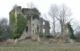 Der beeindruckende Donjon aus dem 15. Jahrhundert bedeckt eine Grundfläche von 12,77 × 10,03 Metern; die Mauern sind 2,12–2,43 Meter dick.[10] Es gab einen Keller und eine Schlafkammer unter einem Gewölbe. Ein weiteres Gewölbe beherbergte einen Rittersaal, der durch drei Fenster in der Südmauer und ein Fenster hoch oben in der Nordmauer belichtet war. Darunter lag ein privater Raum. Der Turm war vier Stockwerke hoch und in der Nordwestecke gab es ein „Hungerloch“-Gefängnis, das man über eine Klappe von einem Gang einer Treppe auf der Ebene des Dachgeschosses erreichen konnte.[11] Es gab keine Schießscharten.[10]