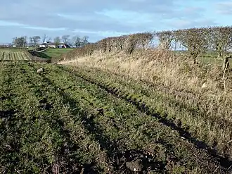 Am traditionellen Standort liegt eine große Zahl von aussortierten Feldsteinen entlang der Hecke, die zur Jockthorn Farm führt.