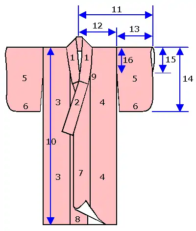 Kimono können wie folgt aus einer Stoffbahn geschnitten werden (es gibt mehrere Schnittvarianten, je nach Kimono):