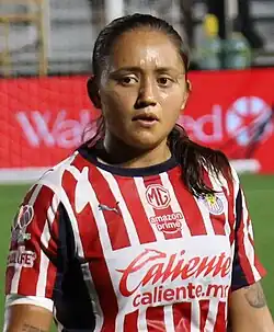 - ↑ Con 16 años, Kinberly Guzmán debutó ayer en la LigaMXFemenil auf der Facebookseite von Chivas Femenil (spanisch)