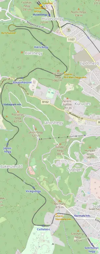 | Kis-Hárs-hegy mh. | Kis-Hárs-hegy war ein Haltepunkt auf halber Strecke zwischen Szépjuhászné und Hárshegy. Aufgrund mangelnder Nachfrage wurde er bereits 1951 wieder geschlossen, Reste sind aber noch heute zu sehen. | ||