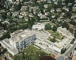Kinderspital 1945; vorne links altes Hauptgebäude, rechts Poliklinik. Dahinter von links nach rechts: Alte Poliklinik, Wäscherei, Infektionsstation, Beobachtungshaus, Schwesternhaus, im Garten die Isolierstation