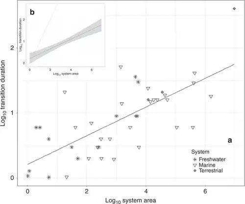 - ↑ a b Gregory S. Cooper, Simon Willcock, John A. Dearing: Regime shifts occur disproportionately faster in larger ecosystems. In: Nature Communications. 11. Jahrgang, Nr. 1, 10. März 2020, ISSN 2041-1723, S. 1175, doi:10.1038/s41467-020-15029-x, PMID 32157098, PMC 7064493 (freier Volltext), bibcode:2020NatCo..11.1175C (englisch).