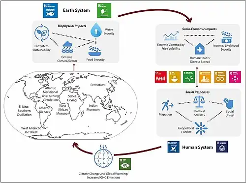 Eine Reihe empirischer Belege spricht für die Existenz von Kipp-Punkten im Erdsystem, die, wenn sie einmal aktiviert wurden, möglicherweise irreversibel[69] eine Verschiebung hin zu einem anderen Ökosystemzustand oder Klimagleichgewicht katalysieren.