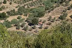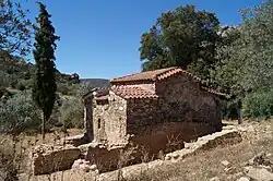 Die Kirche erreicht man am einfachsten über einen Feldweg, der bei der sogenannten Kazarma-Brücke nach Norden führt. Man passiert die Ruinen einer Horizontalrad-Wassermühle und erreicht nach etwa 500 m den Standort. Der rechteckige Bau ist etwa 8 m lang und 4 m breit und wurde auf den Mauern eines römischen Ziegelbaus errichtet. Wie bei fast allen Kirchen in Griechenland ist der Chor nach Osten ausgerichtet. Der mit einem Vordach geschützte Eingang liegt im Westen. In der Mitte des Gebäudes gibt es ein höhergelegenes Querschiff, wodurch die Kirche eine Kreuzform erhält. Die Mauern wurden aus Steinen und dünnen Ziegeln errichtet, wobei sich stellenweise Lagen von Steinen und Ziegeln abwechseln und stellenweise nur Steine oder Ziegel verwendet wurden. Im Süden gibt es zwei Fenster, eines im Querschiff und eines im hinteren Teil des Gebäudes und eines am Chor im Osten. Im Norden gibt es keine Fenster. Die außergewöhnliche innere Raumaufteilung deutet sich schon anhand des Dachs über dem Chor an. So liegt das mittlere Pultdach niedriger als die äußeren Pultdächer und während jene zu den Seiten abfallen, fällt das mittlere nach Osten ab.
