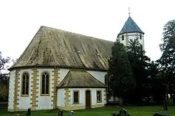 Eine Ursprungskirche war bereits im 13. Jahrhundert vorhanden, an einer Christusfigur aus Sandstein ist die Zahl MCCLIIII (1254) eingemeißelt.[2] Die Art und Darstellung der Bearbeitung lässt diese Zeit vermuten. Diese 64 cm hohe Sandsteinskulptur, Christus als Schmerzensmann, wurde in einer Nische mit in die neue Kirche übernommen. Vermutlich erfolgten einige Umbauten, um den jeweiligen Bedürfnissen gerecht zu werden.[3]