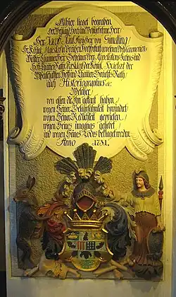 Außen an der Chorostwand der Kirche befindet sich mit dem Grabstein für den kurfürstlichen Amtsschreiber Christoph Schmaill (1613–1678) und dessen Frau Margarethe, geb. Reyher (1620–nach 1679) das älteste erhaltene Grabdenkmal des Friedhofs. Über einem zweigeteilten Tuchgehänge mit Inschriften sind die Wappen der Eheleute angebracht.