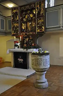 Der Schnitzaltar der Kirche entstand zwischen 1515 und 1520 in der „Freiberger Werkstatt des Apostelmeisters oder seiner Nachfolge“, wie auch die Altäre in Ruppendorf und Seifersdorf.[3] Er zeigt in der Mitte Maria mit dem Kind, neben der einerseits St. Nikolaus und andererseits der Apostel Johannes stehen. Über ihnen schweben zwei Kinderengel, die eine Krone über Marias Haupt halten. In den Flügeln sind je zwei bemalte Reliefs zu sehen. Sie zeigen die Verkündigung, die Geburt Christi, eine Darstellung im Tempel und den Tod Marias. Auf den Rückseiten der Altarflügel befindet sich je ein Temperagemälde, einerseits mit einer Darstellung der heiligen Katharina und anderseits mit der heiligen Margaretha. In der Predella zeigt eine Schnitzerei die Anbetung der Könige.
