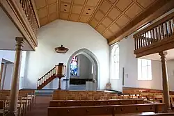 Das Innere der Kirche besteht aus einem schmalen Schiff und einem quadratischen Chor. Durch die Verbreiterung des Kirchenschiffs um 3,20 Meter nach Norden ist das Zusammenspiel von Schiff und Chor heute asymmetrisch und stellt damit einen Sonderfall in der Reihe dörflicher Kirchen in der Stadt Zürich dar. Die u-förmige Empore ruht auf profilierten Eichensäulen. Aus dem 19. Jahrhundert stammt die Kanzel mit dem Schalldeckel, das Chorfenster wurde 1969 von Franz Karl Opitz gestaltet. Aus dem gleichen Jahr stammt der Taufstein der Kirche.[6]