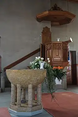 Die in der neuen Kirche eingebaute Kanzel ist an der Brüstung mit Masswerkschnitzerei, ähnlich dem neuen Masswerk im Jugendstil der Chorfenster versehen, die Bestuhlung sowohl im Schiff als auch das Chorgestühl sind Schreinerarbeiten in schlichter Form. Die Schale des Taufsteins aus Juramarmor ruht mit acht Säulen auf einem achteckigen Sockel aus dem gleichen Gestein. Auf der Empore steht eine neuere Orgel.