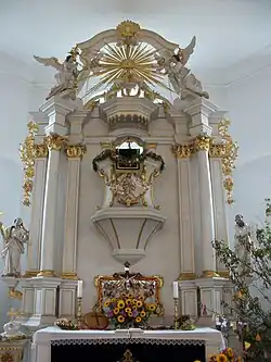 Die einheitliche Ausstattung ist in späten Rokokoformen gestaltet. Das Hauptstück ist ein stattlicher Kanzelaltar aus dem Jahr 1788. Er zeigt in der Predella ein Relief mit der Darstellung des Abendmahls. Am fünfseitigen Kanzelkorb ist eine Rokokokartusche mit Christus als Lamm Gottes angeordnet, seitlich die übereck gestellten korinthischen Säulen, daneben Schnitzfiguren von Johannes Evangelista und Moses. Der Schalldeckel ist in das abschließende Gesims einbezogen; der geschweifte Aufsatz zeigt das Auge Gottes im Strahlenkranz zwischen Engelsfiguren. Die vierseitige Holztaufe mit geschnitzten Rokoko-Ornamenten ist am Fuß mit der Jahreszahl 1792 bezeichnet; der Deckel gehört ursprünglich nicht dazu. Das wertvolle Taufbecken aus der Zeit um 1500 ist mit einer in Messing getriebenen Darstellung der Verkündigung versehen.