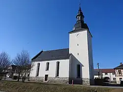 Die barocke Saalkirche wurde errichtet, nachdem der Vorgängerbau am 29. August 1726 bei einem verheerenden Brand im Dorf zerstört wurde. Die Grundsteinlegung war am 15. September 1728, die Einweihung am 5. November 1730. Die Kirche wurde 1816, 1879 und zuletzt 1991 renoviert. Das schmale Langhaus hat drei Achsen und ist mit einem schiefergedeckten Satteldach bedeckt. Die Längsseiten haben schmale hohe Fenster, ebenso das Erdgeschoss des Chorturms. Der massige Chorturm hat vier Geschosse und trägt eine schiefergedeckte Haube, die von einer Laterne gekrönt ist.