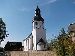 Im Jahre 1322 erfolgte die erste nachweisliche Erwähnung einer Kirche. Die heutige Saalkirche hat einen quadratischen, im Kern romanischen Chorturm und eine Apsis mit einer Apsiskalotte. Beim eingezogenen Chorturm ist das oberste Geschoss achteckig. Darauf sitzt eine bauchige, schiefergedeckte Haube, die eine Laterne trägt. Der Chor ist mit einem gotischen Kreuzrippengewölbe überspannt. Das Langhaus hat drei Achsen und ist mit einem Satteldach bedeckt. Die Flachdecke im Innenraum wurde erst nach dem Mittelalter eingebaut. 1834 wurde die Kirche umgebaut, eine Bezeichnung befindet sich am inneren Portal im Westen. Dabei wurden an den Langseiten des Kirchenschiffs zweigeschossige Emporen errichtet. Der dreiteilige Anbau im Westen, er dient als Vestibül, wurde später errichtet. Die Kirchenausstattung ist schlicht. Die Orgel mit 17 Registern, verteilt auf 2 Manuale und Pedal, wurde 1763 von Popp aus Gera gebaut.[2]