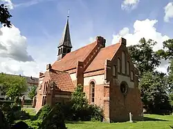 Nach dem Abbruch der baufälligen Vorgängerkirche wurde 1904 mit dem Bau des derzeitigen neuromanischen Gebäudes begonnen. Architekt war Paul Schondorf. Die Kirche wurde in Backstein gemauert, an der West- und an der Südseite wurden Portalanbauten angefügt. Das Gebäude wurde im Zweiten Weltkrieg stark beschädigt und später wieder renoviert. Die Wände sind durch schmale Rundbogenfenster mit Backsteinfassung gegliedert. Der Traufbereich ist umlaufend durch eine Putzblende verziert. Der seitliche Anbau ist ebenfalls durch rundbogige Putzblenden gegliedert. Der leicht eingezogene Chor schließt gerade. Dem Turmgiebel ist ein Anbau mit einem rundbogigen Eingangsportal in einem mehrfach gestuften Gewände vorgebaut.