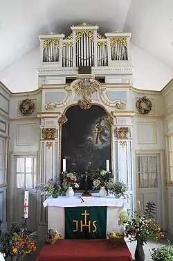 Die einfache hölzerne Altarwand mit geschwungener Front zeigt als Altarbild ein Gemälde mit Christus am Ölberg mit der Jahreszahl 1743, darüber befindet sich die Orgelempore. Unter der Empore liegt die Sakristei mit Eingängen links und rechts des Altarbilds. Die hölzerne Kanzel stammt wohl aus dem 17. Jahrhundert. Von einem älteren Flügelaltar sind noch zwei Tafeln erhalten, welche die Heiligen Apollonia und Ursula zeigen; sie wurden um das Jahr 1530 von Pancratius Grueber aus Großenhain um 1530 geschaffen und befinden sich jetzt im Pfarrhaus. Die Orgel ist ein Werk von Leopold Kohl aus der Zeit um 1865 mit neun Registern auf einem Manual und Pedal, das 1998 von Johannes Lindner restauriert wurde.[1]