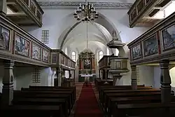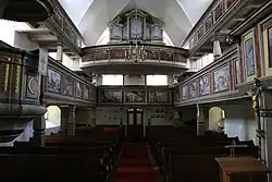 Der durch Um- und Anbauten unregelmäßige Baukörper endet in einem Fünfachtel-Chorschluss. Der Chorturm ist bis zum Satteldach vier-, darüber achteckig ausgebildet und wird durch ein Zeltdach abgeschlossen. Im Inneren ist das Bauwerk durch ein dreijochiges Kreuzgratgewölbe geschlossen. Das Gewölbe unter dem Turm mit spätgotischem Rippenprofil stammt vermutlich aus dem 15. Jahrhundert, diejenigen des Schiffes und des eingezogenen Chores aus der Zeit um 1700. Das Fresko mit der Darstellung der Dreifaltigkeit stammt aus dem Jahr 1724. An den Seiten und im Chor sind zweigeschossige Holzemporen eingebaut, die im Jahr 1884 überdeckten, 1994 wieder freigelegten Bilder wurden von Nikolaus Prescher im Jahr 1724 geschaffen, sie zeigen in typologischer Gegenüberstellung Darstellungen aus dem Leben Christi und dem Alten Testament.