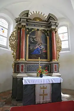 Der hölzerne Hochaltar stammt aus dem Jahr 1694, in der Mitte befindet sich zwischen kannelierten Säulen ein Gemälde mit der Darstellung Christi am Ölberg; darüber ist ein gesprengter Giebel mit Gloriole angeordnet, das Ganze wurde 1884 restauriert.