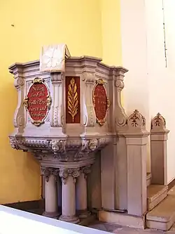 Die Kanzel ist ein kostbares Stück und eine Stiftung des Unternehmers Robert Guthmann. Sie besteht aus massigen, in der Kunststeinfabrik erzeugten und vom Bildhauer bearbeiteten Kalksandsteinblöcken. Vier kurze Säulen tragen den schweren, mit Engelsköpfen und Bibelsprüchen verzierten Predigtstuhl.