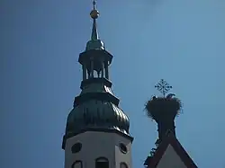 Regelmäßig brüten Weißstörche auf dem Kirchendach.