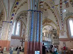 Das Langhaus ist durch zwei Pfeiler in sechs Joche geteilt, die ein breites Hauptschiff und zwei schmalere Seitenschiffe bilden. Die Gewölbebasen aller drei Schiffe liegen auf gleicher Höhe, jedoch reichen die Joche des Mittelschiffs höher als die der Seitenschiffe. Die Gurtbögen aller drei Schiffe haben runde Unterzüge. Von den Arkadenbögen hat nur der nordöstliche einen solchen Unterzug. Der Chor hat die gleiche Breite wie das Mittelschiff, und die östlichen Stirnwände beider Seitenschiffe sind mit Fenstern versehen. Die westlichen Stirnwände sind hingegen fensterlos, da der mächtige Westturm bis vor deren Mitten reicht.[12] Der südliche Pfeiler ist ein frühgotischer Kreuzpfeiler aus vier Rechteckprofilen, in deren Winkeln Rundstäbe eingefügt sind, die allerdings in dieser Kirche kurz vor dem Kämpferband in Rechteckprofile übergehen. Der nördliche Bündelpfeiler besteht aus vier halbrunden und acht Viertelstäben sowie vier Kehlen, was stilistisch schon der Hochgotik zuzuordnen ist. Die Gewölbe sind Domikalgewölbe aus steilen und hoch aufragenden Kappen, es sind stark gebuste Kreuzgewölbe mit zarten Bandrippen und steilen spitzbogigen Gurten.[13]