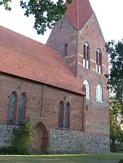 Im Westen erhebt sich ein quadratischer Turm mit hohem achtseitigen Spitzhelm, auch Bischofsmütze genannt. Der Turm ist wie die südliche Portalvorhalle eine Zutat der Spätgotik, wohl nach 1400.[11] Besonders auffällig ist seine blockhaft kubische Form. Die Blenden und segmentbogigen Schallluken der Seitenwände sind paarig und werden durch Koppelblenden zusammengefasst. Nahtlos gehen alle vier Seitenwände in die schmucklosen Schildgiebel des Turmhelmes über.