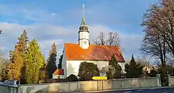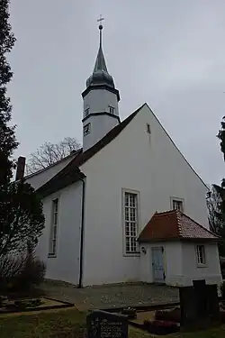Das Bauwerk ist ein verputzter Bruchsteinbau mit eingezogenem Chor und niedriger halbrunder Apsis sowie einem hohen Satteldach mit oktogonalem hölzernem Dachreiter. An der Nordseite befindet sich ein sehr hoher Logenanbau des 17. Jahrhunderts.