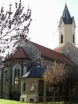 Im Jahr 1859 entstand – nach dem Abriss der bisherigen romanischen Chorturmkirche – ein neugotisches Kirchengebäude nach Plänen von Architekt Johann Ernst Wilhelm Zocher. Man verbaute Beuchaer Granit (Quarzporphyr) zu Zyklopenmauerwerk. Das zunächst schlichte Gotteshaus wurde zwischen 1901 und 1905 von dem Leipziger Architekten Julius Zeißig und dem Maler Richard Schulz erneuert und kunstvoll ausgestaltet.[3][4] In dieser Zeit wurden auch die Treppentürme am Kirchturm angebaut.[5]