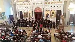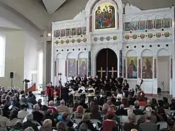 Ausschreibungsgemäß bildet das Innere ohne tragende Elemente einen unverstellten Kirchenraum, in orthodoxer Tradition der Naos, wie er typisch für einen byzantinischen Bau unter zentraler Kuppel ist.[2] Der Naos ist mit Bänken versehen und misst 630 Quadratmeter.[43] Über dem Eingangsbereich am Hauptportal befindet sich eine Empore, die sich als flacher Bogen in den Kirchraum vorschiebt. Zwei Treppen, die sich um jeweils um die westlichen tragenden Pfeiler des Raums winden, führen zur Empore hinauf.