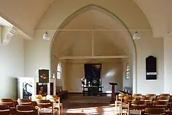 Das Innere der Kirche ist einfach. Zunächst dienten als Kirchengestühl dienten Bänke der Kantine der Spandauer Gewehrfabrik der Deutschen Werke, die 1970 erneuert und 1991 durch Stühle ersetzt wurden. Von der Kanzel, die für die St.-Nikolai-Kirche 1839 gebaut wurde und dort bis 1903 stand, sind Teile wieder verwendet worden. Drei Bilder der vier Evangelisten sind an der neuen Kanzel angebracht, das vierte fand in der Brüstung der Empore, die ebenfalls aus der Nikolaikirche stammt, seinen Platz. Aus dem Kanzelfuß entstand das Taufbecken, das mit Teilen des Schalldeckels verziert wurde. Der Altar ist ein einfacher Holztisch mit einem Bild von Jesus im Garten Gethsemane, entstanden 1925. Von der Kirchengemeinde der Dorfkirche Staaken wurden zur Einweihung der Kirche ein Kelch und eine Patene aus vergoldetem Silber gestiftet. Seit 1981 gibt es einen neuen Kelch, der dem alten Original ähnelt.